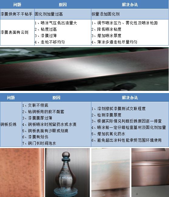 銅基材涂裝氟碳涂料時,需對基材進(jìn)行前處理去除表面油脂、浮灰及其他附著物,**銅基材表面干凈整潔,為氟碳涂層提供良好的附著力。但氟碳涂料施工過程中或施工后,因諸多因素導(dǎo)致漆膜易出現(xiàn)某些問題。萬工氟碳漆根據(jù)技服人員現(xiàn)場服務(wù)反饋,總結(jié)部分問題及相關(guān)解決方案供廣大客戶參考。