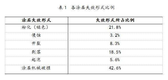 石油鉆采設(shè)備主要處于沙漠干旱環(huán)境、陸地大氣環(huán)境和海洋潮濕環(huán)境。經(jīng)過多年統(tǒng)計,石油鉆采設(shè)備在服役期間主要發(fā)生的涂層失效類型有粉化、侵蝕、開裂、剝落、起泡、涂層機械破損(磕傷、劃傷)等六類,涂層失效形式所占比如表1中所示。