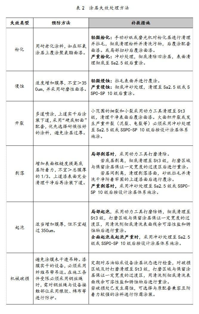 涂層失效的及時發(fā)現(xiàn)和處理對預(yù)防和阻止因涂層防護作用失效引發(fā)的腐蝕有非常重要的意義。針對石油鉆采設(shè)備常發(fā)生的六種失效形式,在表2中詳細列舉了六類失效情況的處理方法,采取合理的修復(fù)措施以達到恢復(fù)涂層防護能力的目的。