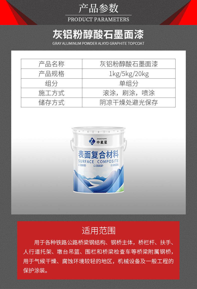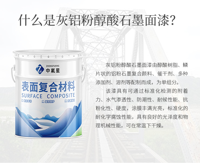 【中氟星】灰鋁粉醇酸石墨面漆由醇酸樹脂、鱗片狀的鋁粉石墨復合顏料、催干劑、多種添加劑、溶劑等配制而成,為單組分。該漆具有可通過標準化檢測的附著力、水氣滲透性、防潮性、耐候性能、抗粉化性、硬度,涂膜豐滿光亮,標準化的耐化學腐蝕性能,具有良好的光澤度和物理機械性能,可在常溫下干燥。