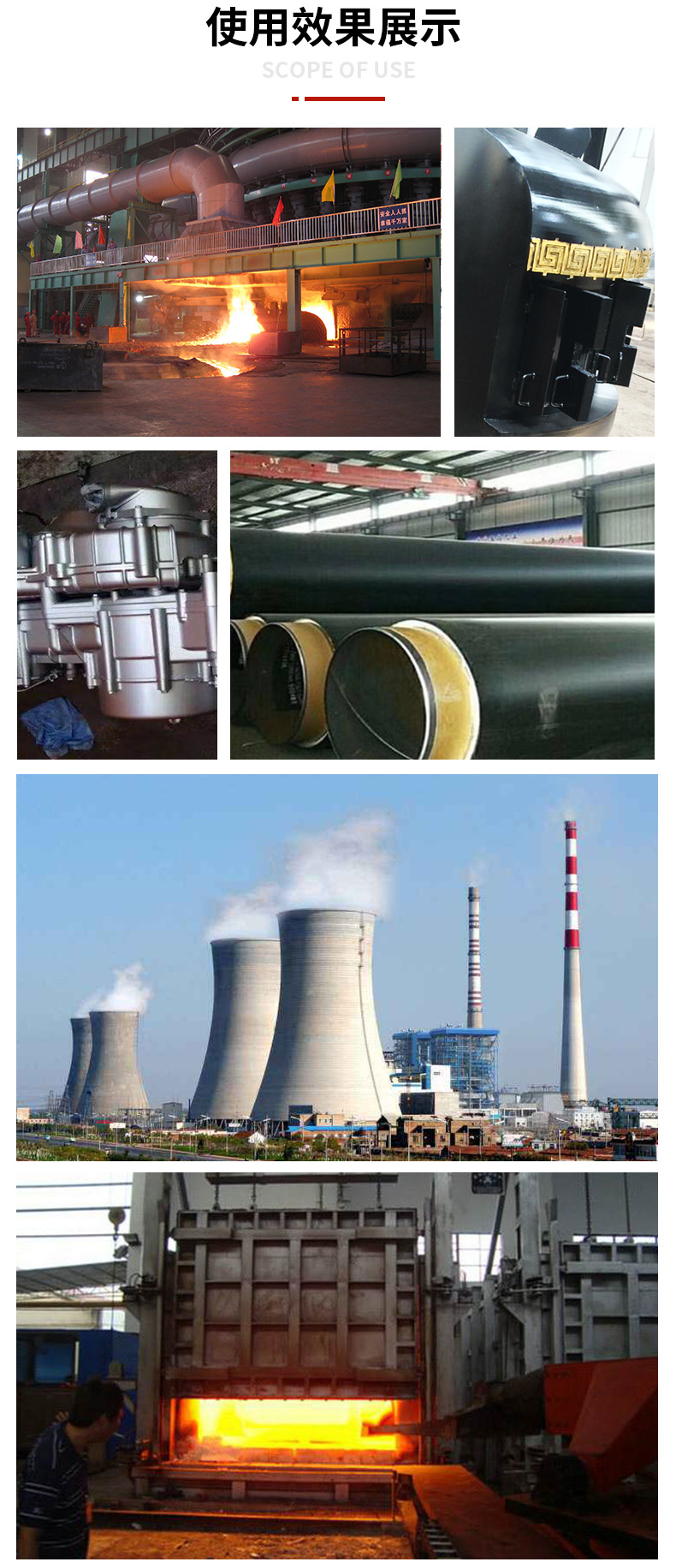 應(yīng)用于軍事工業(yè)、石油化工、建材工業(yè)等國民經(jīng)濟(jì)的重要行業(yè),廣泛用于高溫爐、熱風(fēng)爐內(nèi)外壁、煙囪、煙道、烘道、排氣管、高溫?zé)釟夤艿馈⒓訜釥t、熱交換器、管道、煙囪、電機(jī)、電器等耐熱保護(hù)。
