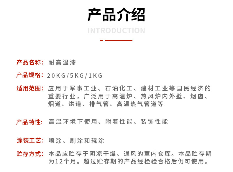【中氟星】耐高溫漆具有可通過標(biāo)準(zhǔn)化檢測(cè)的耐熱性、耐溫差變化、耐化工大氣、耐水、耐海水、電絕緣性,可常溫自干,干燥迅速,施工方便。耐高溫漆用于200°℃~1000°℃的鋼鐵表面,具有可通過標(biāo)準(zhǔn)檢測(cè)的耐高溫、防腐防銹等性能檢測(cè)試驗(yàn)。該涂料在冶金、石油、化工高爐、熱風(fēng)爐內(nèi)外壁、煙囪、煙道、排氣管、熱交換器等。