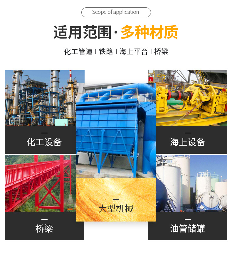 廣泛用于室內(nèi)外各種輕重金屬和水泥結(jié)構(gòu)的表面,起到防銹、防腐蝕的保護(hù)作用,可涂覆于不同環(huán)境下使用的鐵路橋梁、高壓輸電塔、集裝箱、海上鉆探及采油設(shè)備等