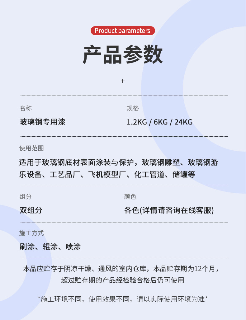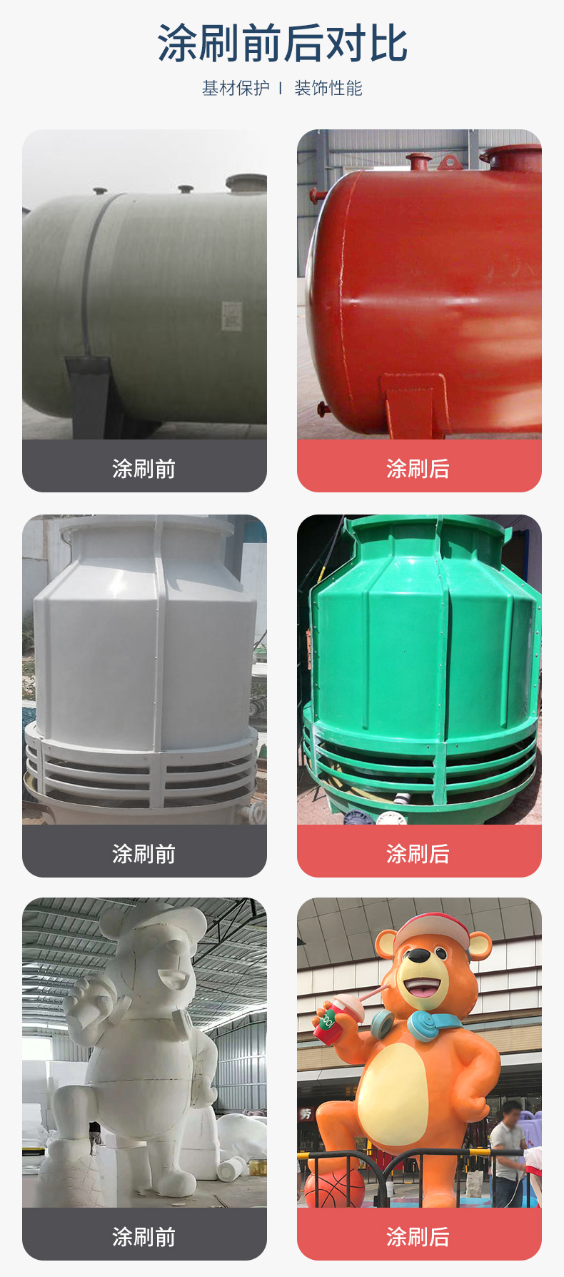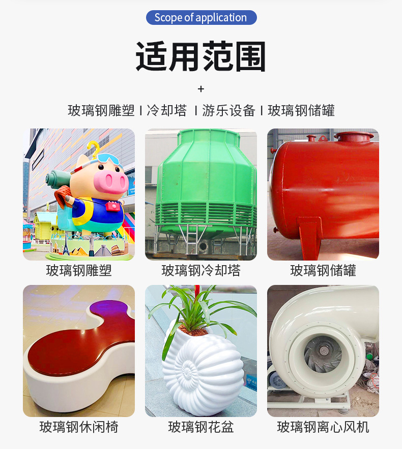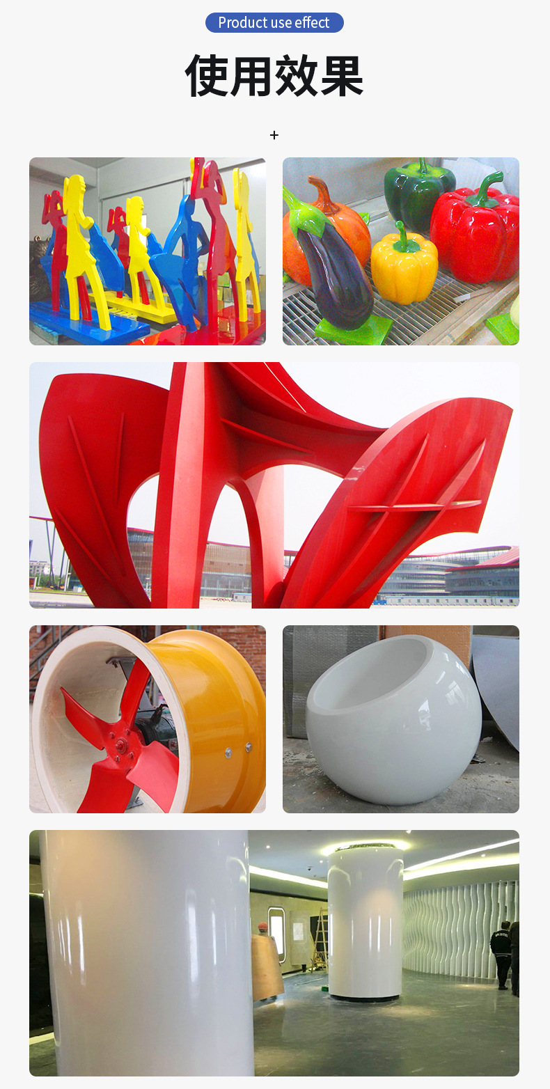 適用于玻璃鋼底材表面涂裝與保護(hù),玻璃鋼雕塑、玻璃鋼游樂(lè)設(shè)備、工藝品廠、飛機(jī)模型廠、化工管道、儲(chǔ)罐等。