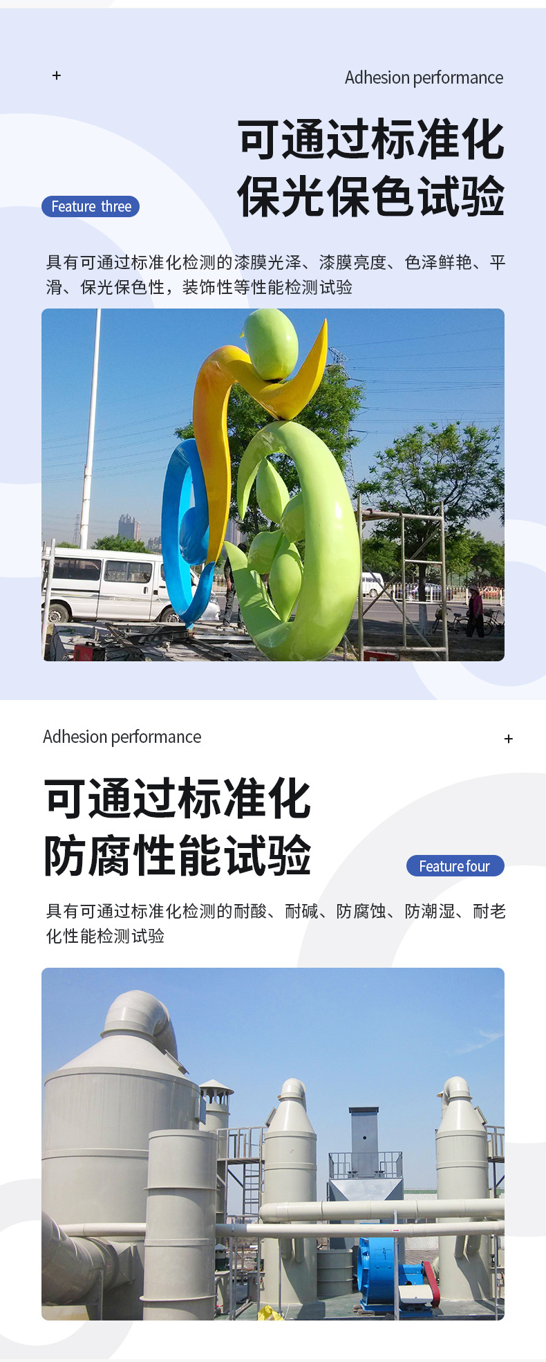 可通過(guò)標(biāo)準(zhǔn)化附著性能試驗(yàn):具有可通過(guò)標(biāo)準(zhǔn)化檢測(cè)的附著力、粘附強(qiáng)度、漆膜堅(jiān)韌等性能檢測(cè)實(shí)驗(yàn);不易脫落、裂紋、剝落、掉皮、粉化等現(xiàn)象
