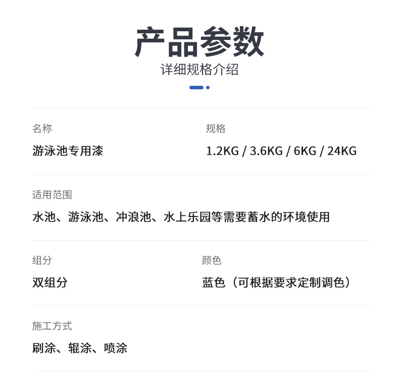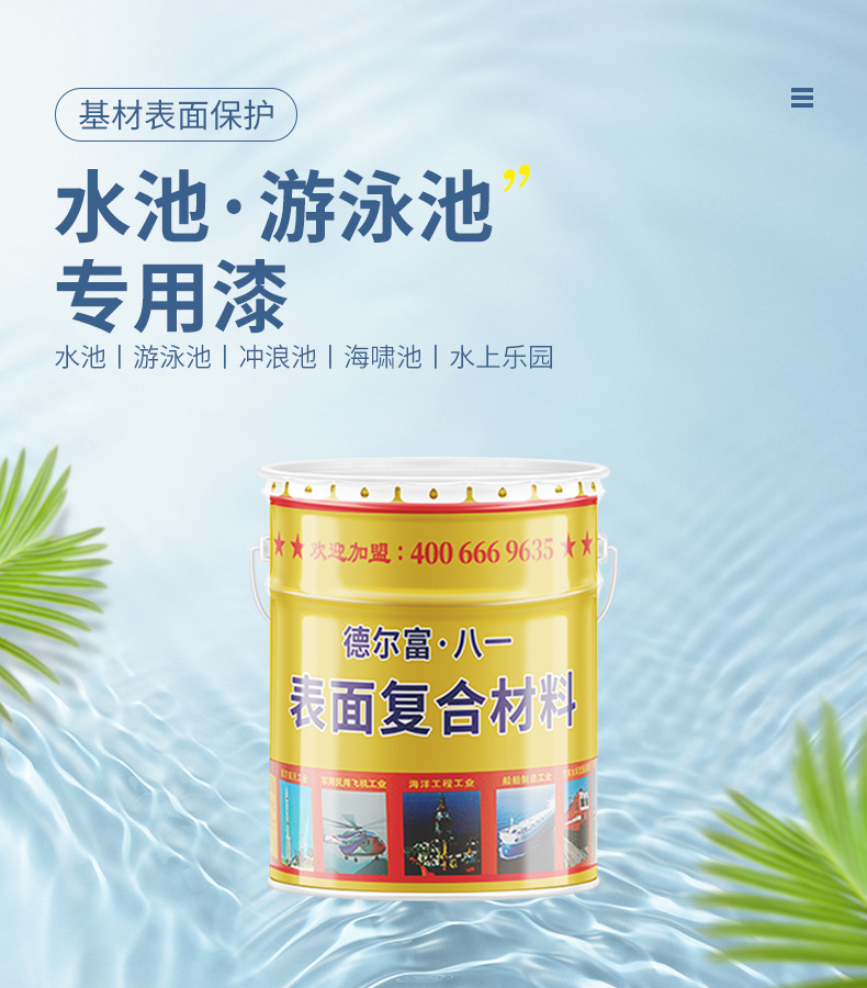 【德?tīng)柛弧?strong>游泳池專用漆是一種專為水池、游泳池等長(zhǎng)時(shí)間蓄水場(chǎng)景所研制的對(duì)環(huán)境友好型涂料,主要用于混泥土制及鐵制的游泳池,蓄水池(非飲用水)的涂裝,具有可通過(guò)標(biāo)準(zhǔn)化檢測(cè)的防滲水、防腐蝕、風(fēng)化、耐水浸泡、耐干濕交替、防止藻類生長(zhǎng)等性能。