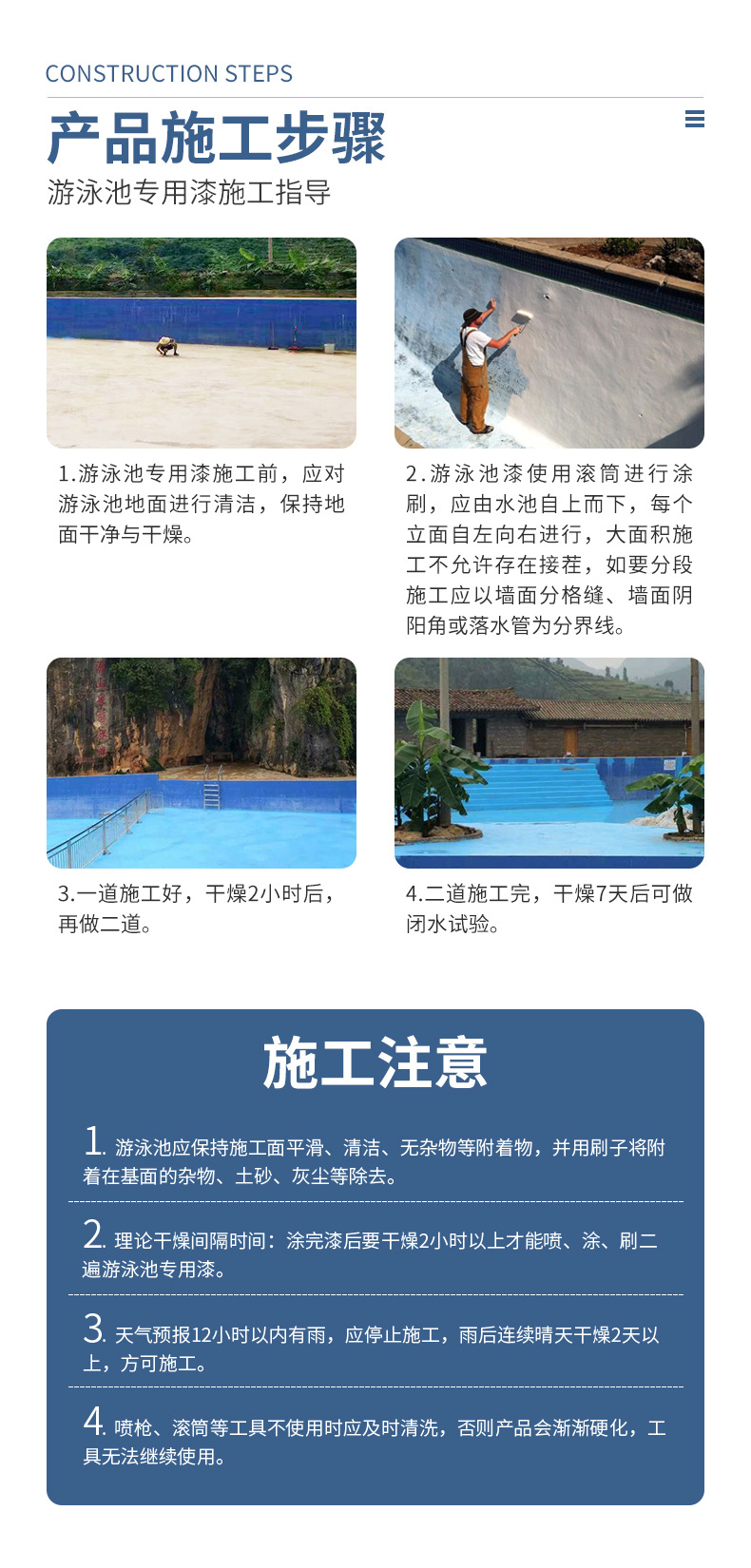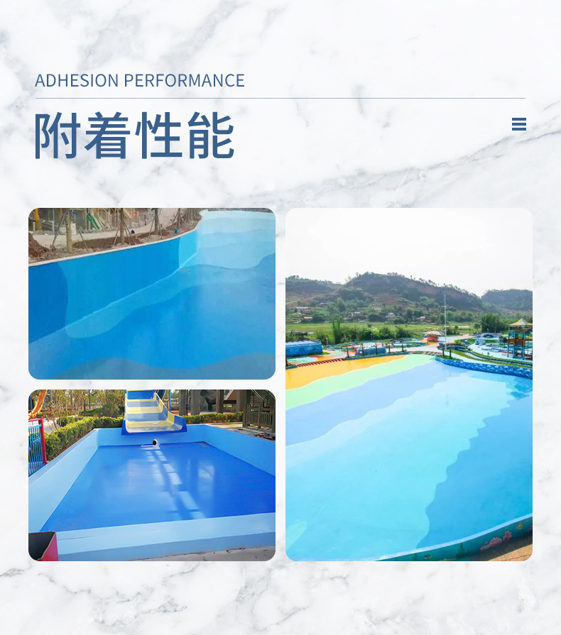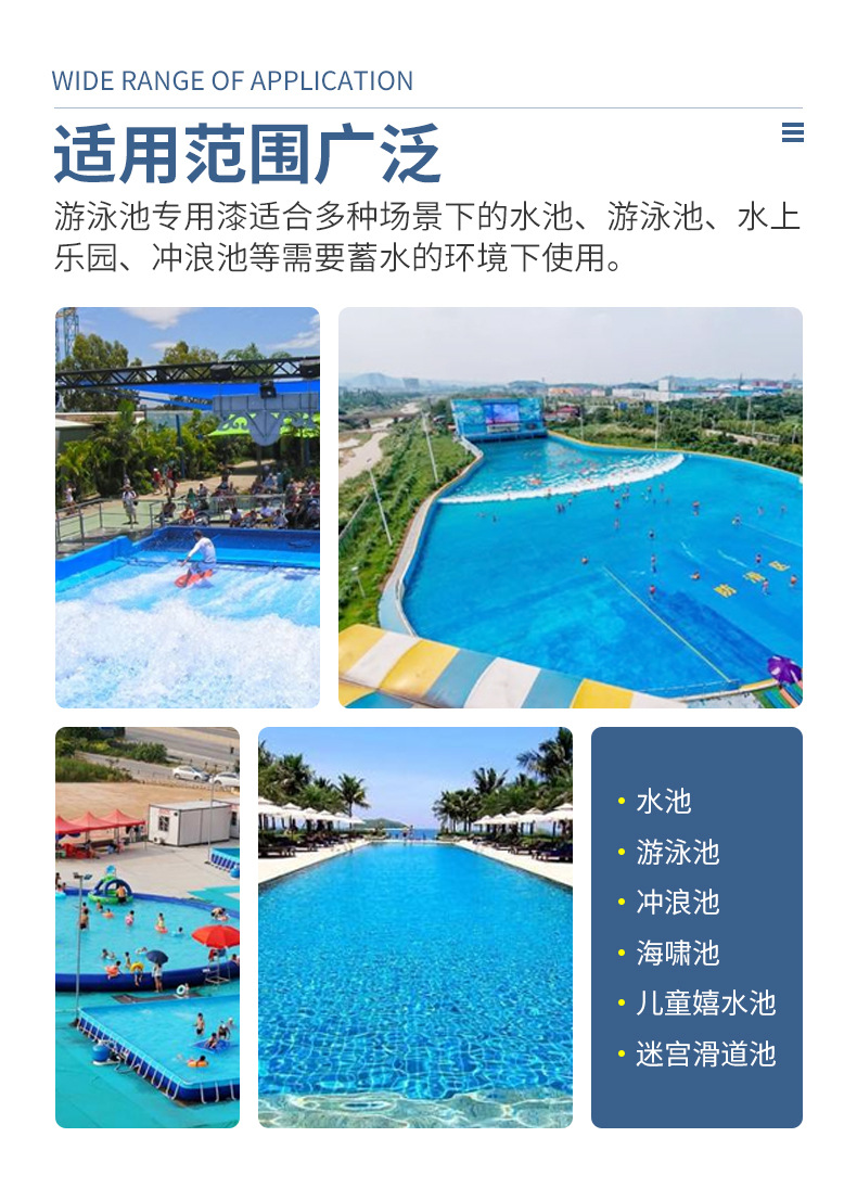 主要適用于多種場(chǎng)景下的水池、游泳池、水上樂(lè)園、沖浪池等需要蓄水的底部及四周表面裝飾保護(hù)用,容易修補(bǔ),可以用來(lái)替代傳統(tǒng)的瓷片。